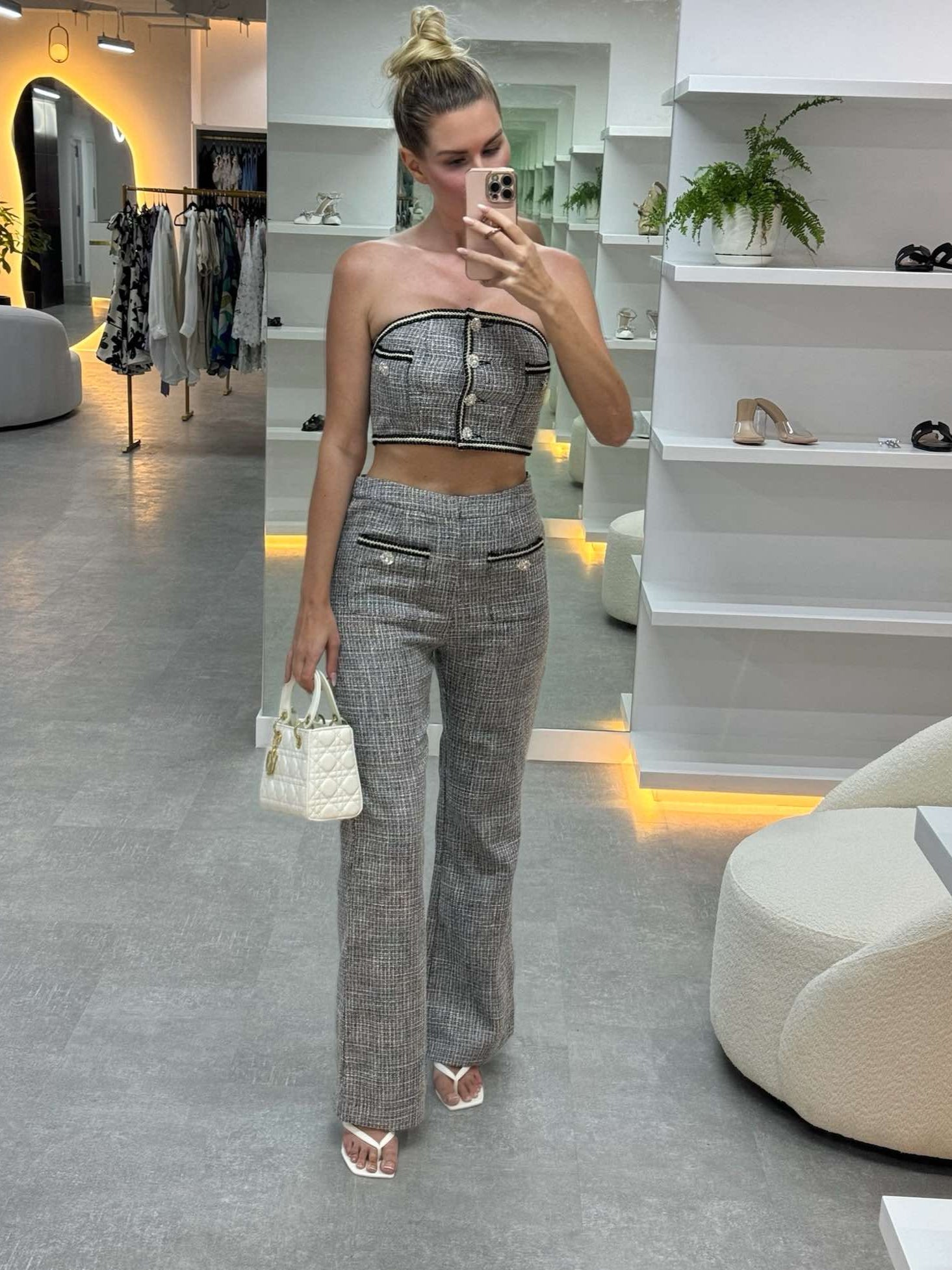 Get ready to slay in this Tweed Ensemble Pants Set. The ultimate in chic fashion, this set features classic tweed fabric and a stylish pant silhouette. Take your outfit game to the next level with this versatile and trendy set. Who says you can't have comfort and style?